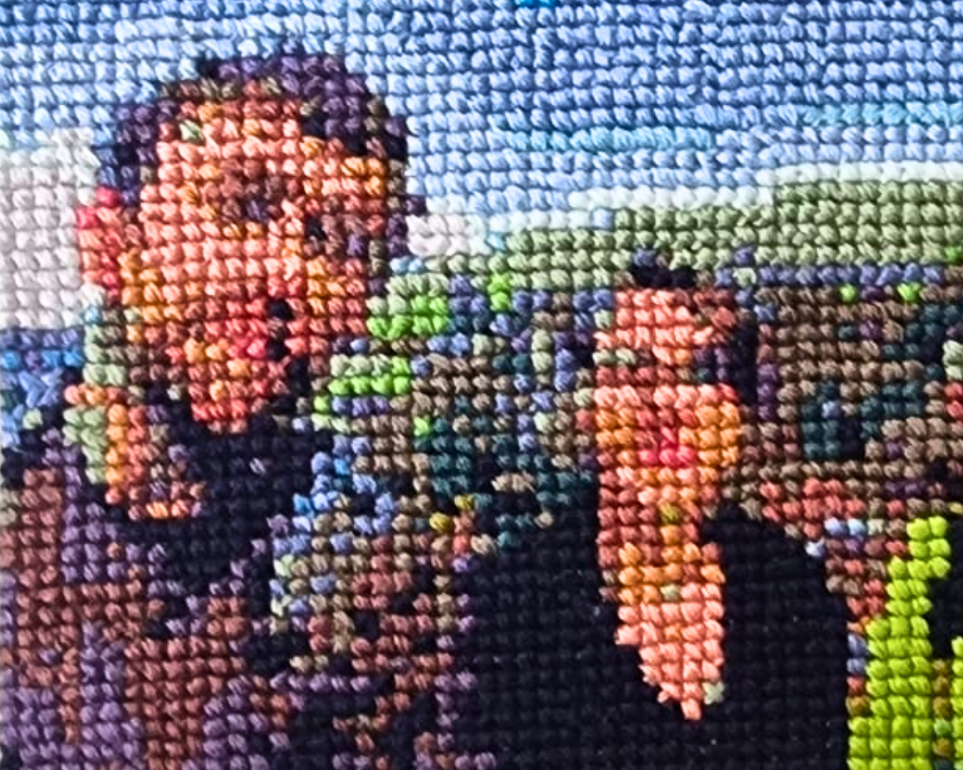 W jaki sposób pamiętamy wspomnienia z dzieciństwa? Co, w tym ulepku z wrażeń, emocji i opowiadanych po latach historii, jest faktem, a co fantazją? Czy ta druga jest mniej prawdziwa niż rzeczywistość? Kiedy o tym myślę, wszystko mi się miesza. Gdy wróciłam do haftowania w dorosłym życiu, zaczynałam od haftu krzyżykowego. Odkryłam wówczas program komputerowy, który dowolne zdjęcie przerabia na gotowy wzór do haftu krzyżykowego.