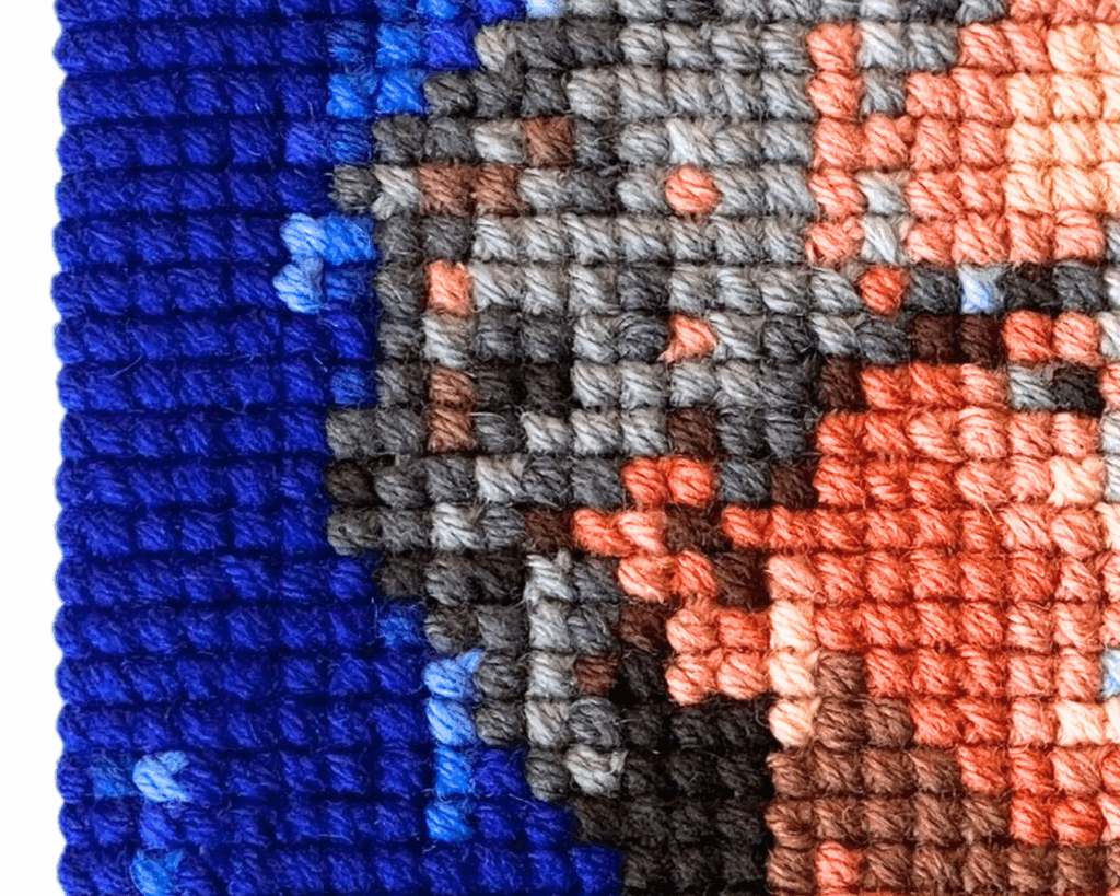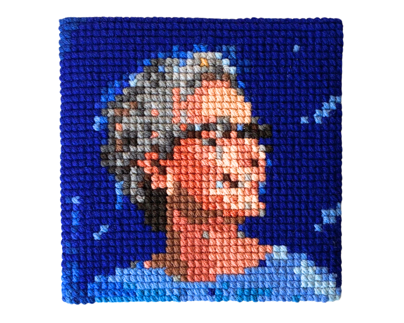 „Jaką dojrzałą kobietą będę? Jaką mogę być?” – to pytanie stało się punktem wyjścia dla tego cyklu prac. Wpisując w bank zdjęć generatywnej AI frazę „portret starszej kobiety”, otrzymałam wizerunki spokojnych, spełnionych seniorek – gotowych na spacer z kijkami, nonszalanckich lub klasycznych, jak z katalogu marki odzieżowej. Ich obrazy odtworzyłam w hafcie krzyżykowym, gdzie każdy krzyżyk stał się pikselem, a tkanina stała się przestrzenią dla refleksji nad współczesnymi narracjami kulturowymi.