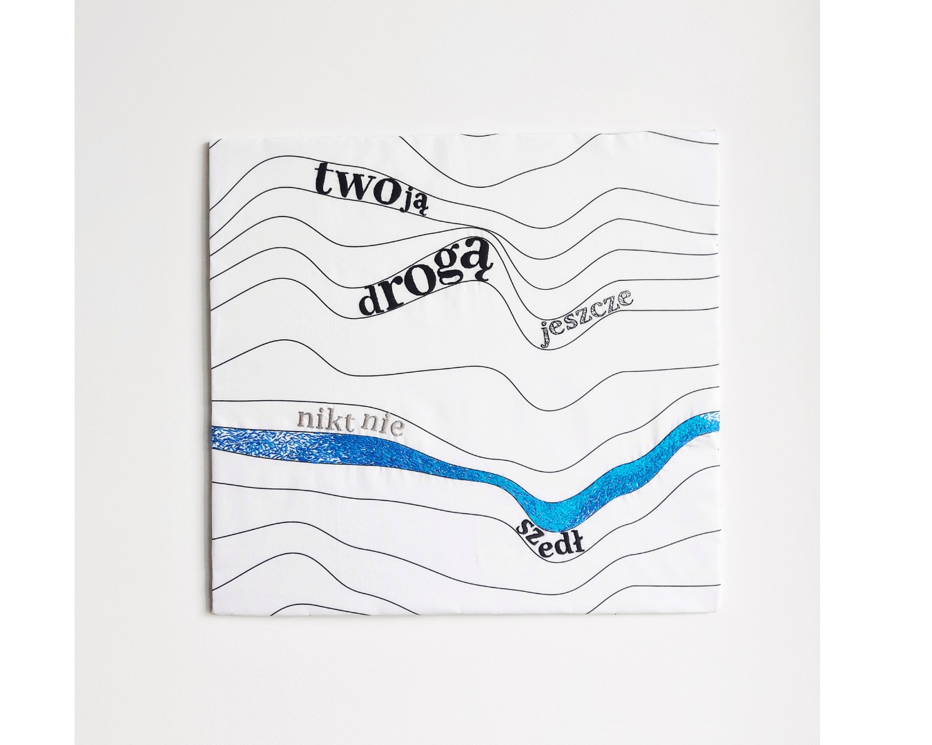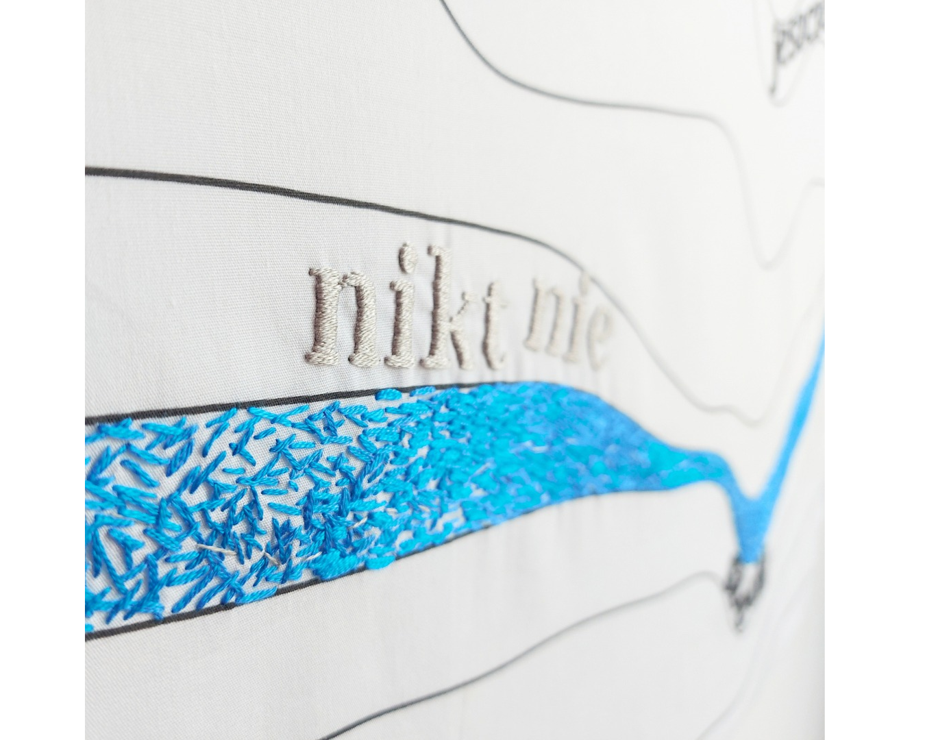Fascynują mnie mapy jako tła do haftu. Czasem umieszczam na nich wyhaftowane zdania – drogowskazy. Czemu właśnie mapy? Kiedy wyruszam w drogę i mam ze sobą mapę to wiem, że tak łatwo się nie zgubię. Mapa daje szerszy obraz, wiadomo jaki dystans dzieli punkt a i b, oraz jakie po drodze czyhają przeszkody. Czasem brakuje nam mapy, takiej życiowej. Mamy wrażenie, że szlak powstaje w miarę chodzenia. Długo zajęło mi dojście do takiego mentalnego miejsca, w którym czuję, że idę w dobrym kierunku. Kiedyś miotałam się w jego poszukiwaniu, teraz łapię się na niecierpliwości, że może mogłabym iść szybciej. Kiedy niepokój mija i przestaje zawężać myślenie, to wiem, że wszystko przebiega zgodnie z planem.
